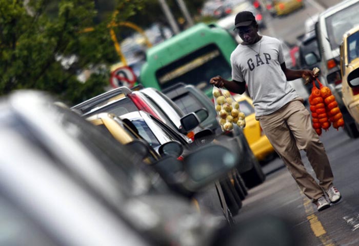 La situación es igual de penosa para Flor Ángela Vega, una extranjera que recorre Carabobo, calle comercial por excelencia, arrastrando un coche cargado con tintos, mecato y cigarrillos. La mañana es soleada y en su rostro hay esperanza. “Hoy al menos está el sol, ojalá no llueva, pero eso ya es muy difícil”. Si en un día sin nubes ella puede vender $30.000, con aguacero si acaso llega a $15.000. Debe cubrir el coche con un tendido y buscar refugio debajo del viaducto del metro o arrimarse a un local. Se moja de todos modos. Y piensa en al menos hacer para pagar la habitación donde vive con tres hijos.
