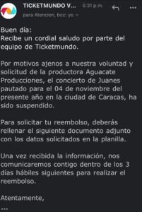 El mensaje enviado por Ticketmundo fue difundido por las redes sociales donde se lee: «Por motivos ajenos a nuestra voluntad y solicitud de la productora Aguacate Producciones, el concierto de Juanes, pautado para el 4 de noviembre del presente año, ha sido suspendido».