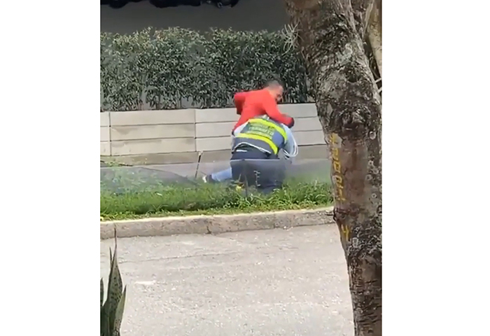 Pero todo se salió de control, pues al no tener ningún documento, la moto debía ser inmovilizada. Ante esto, el conductor de la moto se llenó de rabia y se fue a los golpes con uno de los agentes de tránsito.