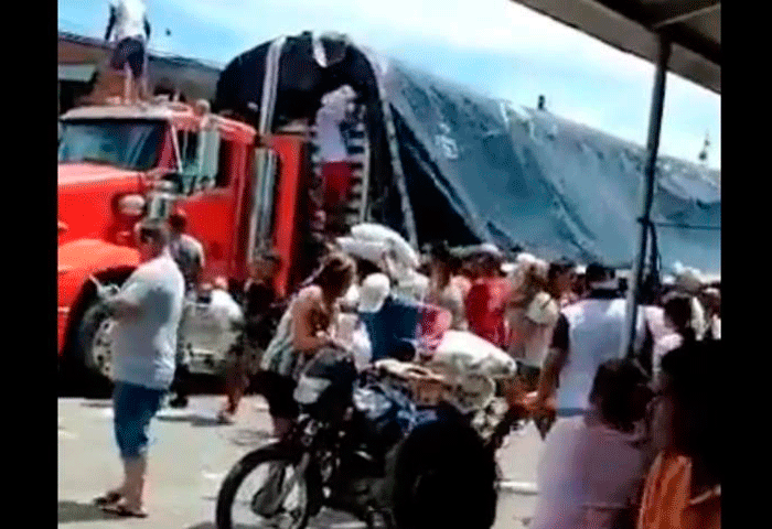 En motos y caminando llegaron decenas de personas hasta una tractomula detenida en el corregimiento Jardín, jurisdicción de Cáceres, Bajo Cauca antioqueño, para saquearla.