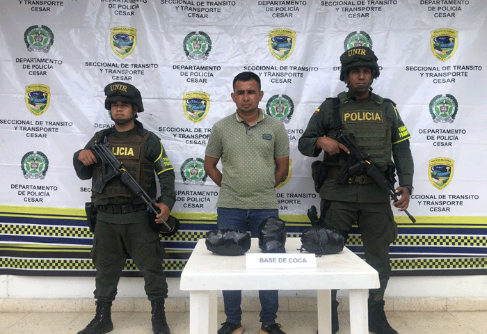 Mediante labores de registro y control, personal adscrito al cuadrante vial 11 Aguachica, en el kilómetro 4, tramo vial Aguaclara – Ocaña, se logra la captura en flagrancia, de Jesús Eduardo Pérez León, de 33 años, quien se transportaba como pasajero en el vehículo tipo camioneta, quien al momento de realizarle una requisa se encuentra en un bolso tipo morral color rojo y dentro de este cuatro paquetes ovalados envueltos en bolsas plásticas de color negro, que en su interior contienen 3.340 gramos de base de coca. Sustancia avaluada en $10.000.000 millones de pesos.