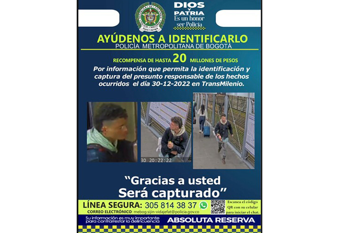 La Policía Metropolitana de Bogotá publicó el cartel del presunto homicida en Transmilenio el pasado 30 de diciembre.