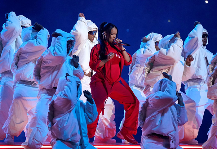 Vestida completamente de rojo, la megaestrella Rihanna ofreció en el descanso del encuentro de la Super Bowl entre Kansas City Chiefs y los Philadelphia Eagles, su primer concierto en siete años en una acrobática y sensual actuación mostrando su nuevo embarazo.