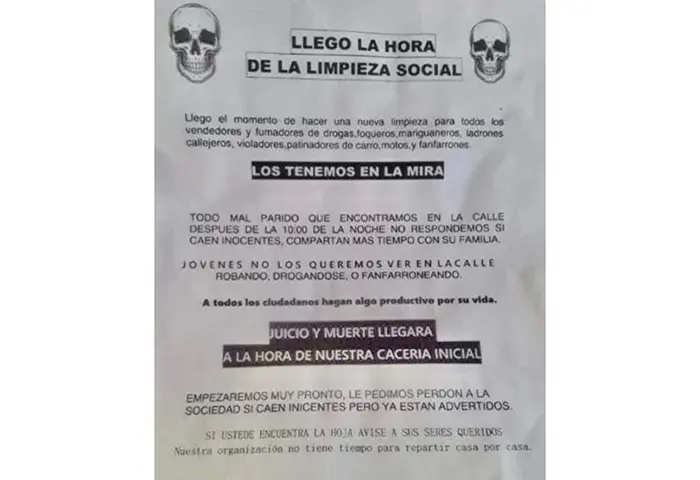 “Llegó el momento de hacer una nueva limpieza social para todos los vendedores y fumadores de droga, ladrones callejeros, patinadores de carro, moto y fanfarrones…”, se lee en uno de los panfletos que desde inicio de semana le roba la tranquilidad a la comunidad.