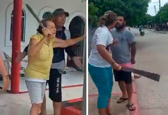 Lo cierto es que en la gresca se vieron involucradas dos mujeres y dos hombres. En el videoclip aficionado, se observa a las dos féminas (una de la tercera edad) con machetes en mano, amenazando a otro hombre que se disponía a pelear con un familiar de ellas.