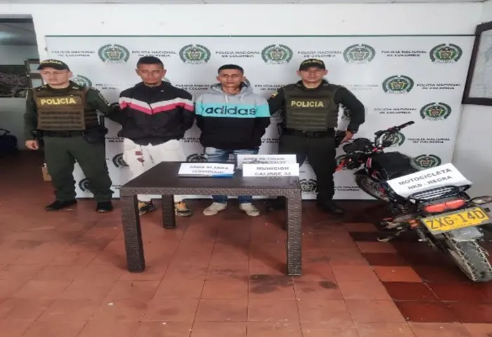 El segundo caso operativo fue en Río de Oro, en el barrio La Umata, donde fueron capturados Jhon Quintero, de 18 años, Y Brayan Torres, de 27 años, a quienes se les halló en su poder un arma de fuego tipo revolver, calibre 32 largo, que en su interior aloja cuatro cartuchos, y una motocicleta incautada marca NKD, sin número de motor.