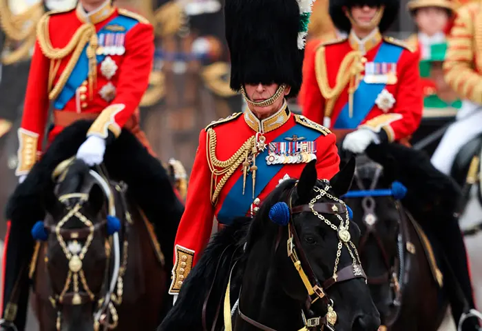Bajo un cielo cubierto, Carlos III salió en procesión del Palacio de Buckingham, seguido de su hijo Guillermo, heredero del trono, su hermano el príncipe Eduardo y su hermana la princesa Ana, todos a caballo.