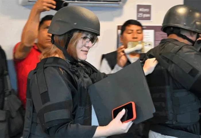 Verónica Sarauz, viudad de Fernando Villavicencio, usa un chaleco y un casco antibalas durante un evento público