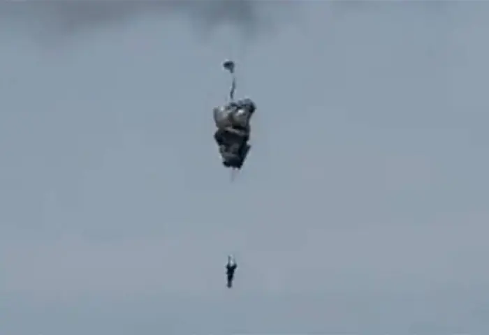 En imágenes que quedaron captadas por uno de los soldados que hacía presencia en el lugar se alcanza a apreciar como el soldado, en medio de su desespero, intenta abrir el paracaídas y al ver que no funciona, toma una posición vertical, lo que hace que impacte ante la vegetación del lugar, generando una aparatosa caída.
