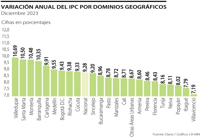Al segmentar por ciudades, varias capitales de la costa Caribe ocuparon las primeras posiciones entre las urbes con mayor inflación en 2023, impulsadas por variaciones mayores a 10% en la división de arriendos y servicios públicos, por el incremento en los costos de la energía.