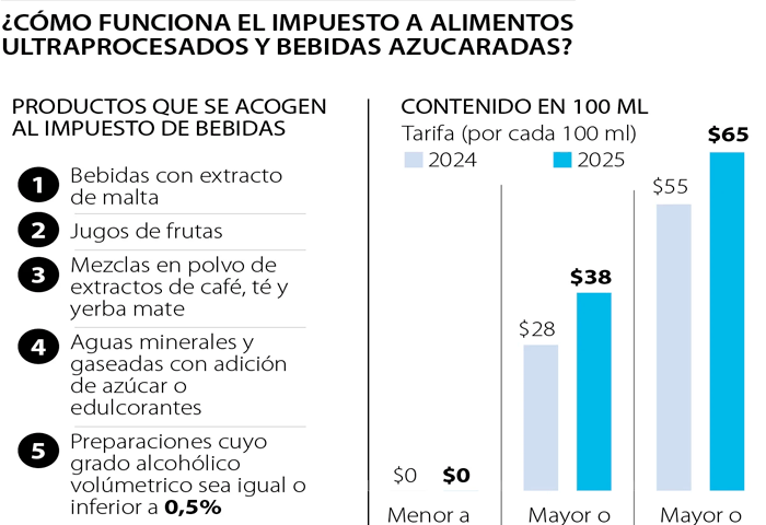 De acuerdo con la Dian, la tarifa del impuesto a las bebidas ultraprocesadas azucaradas se expresa en pesos por cien mililitros de bebida. Si en 100 ml de bebida se encuentran menos de seis gramos de azúcares añadidos no aplica el impuesto; si la cantidad de azúcares se encuentra entre seis y 10 gramos, se deberán pagar $28 y $38 en 2025; y si es igual o mayor a 10 gramos será de $55 y $65 para el próximo año.