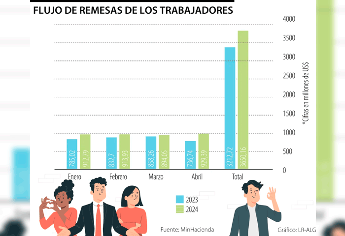 Solo en abril, las remesas tuvieron un incremento de 26,14% frente al mismo mes del año pasado hasta los US$929,39 millones, siendo el mes en el que más se recibieron remesas este año.