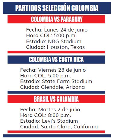 El debut de la Selección Colombia será el lunes 24 de junio a las 5:00 p.m. (hora colombiana) ante Paraguay. Posteriormente, el equipo nacional jugará el viernes 28 de junio a la misma hora, pero enfrentando a Costa Rica. Su último encuentro en la fase de grupos ante Brasil será el martes 2 de julio a las 8:00 p.m. (hora colombiana).