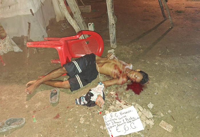 “Por jíbaro y rata. Siguen robando, sigo matando, AGC”, fue el mensaje escrito en un panfleto dejado a un lado del cadáver de Moner de Jesús Torres Restrepo, de 27 años de edad, quien fue asesinado a tiros frente a su vivienda ubicada en el barrio Villa Carla, zona rural del municipio de Chiriguaná, Cesar.