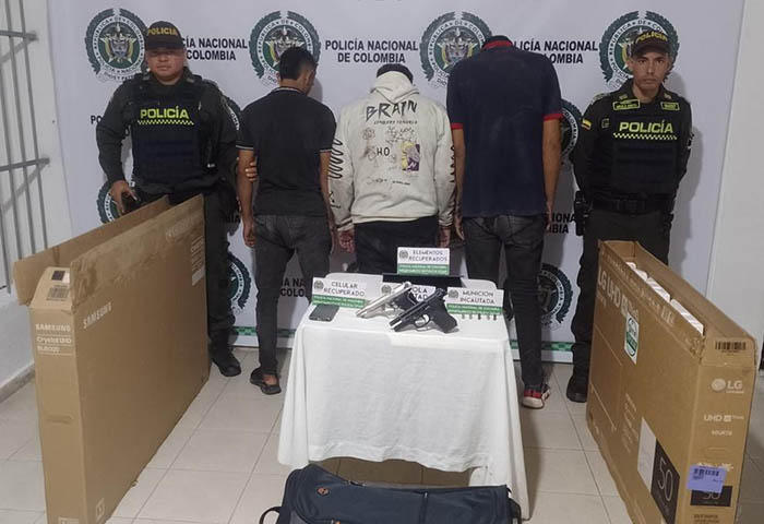 Los detenidos, identificados como Cristian Gómez, Santiago Barahona y McKley Melgarejo, fueron encontrados en posesión de dos televisores, un morral con prendas de vestir, una cartera, un portátil, y joyas con piedras preciosas, entre otros objetos. Además, se les incautaron dos armas de fuego tipo traumática, dos proveedores, dos cartuchos modificados y cuatro cartuchos originales.