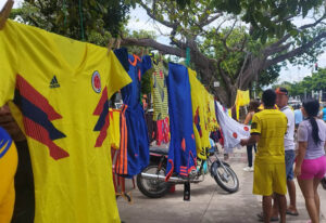 “Desde que Colombia clasificó el pasado miércoles, tras vencer a Uruguay, la alegría ha invadido a la ciudad. Toda la mercancía que he traído se ha vendido, incluso he tenido que hacer pedidos extras para poder cubrir la alta demanda, todo ha salido”, manifestó Yhonny Naranjo, comerciante que por más de 25 años se ha dedicado a la venta de camisetas de distintas selecciones de fútbol.