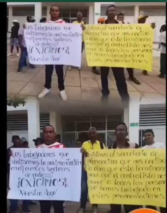Más de un mes tienen esperando un grupo de trabajadores, el pago de la labor cumplida en una obra de pavimentación en el corregimiento de Llerasca, municipio de Agustín Codazzi, por lo que realizaron una protesta frente a la Alcaldía Municipal en busca de respuesta por parte del alcalde, Hernán Baquero, o del secretario de Planeación, quien se ha negado a dar la cara.