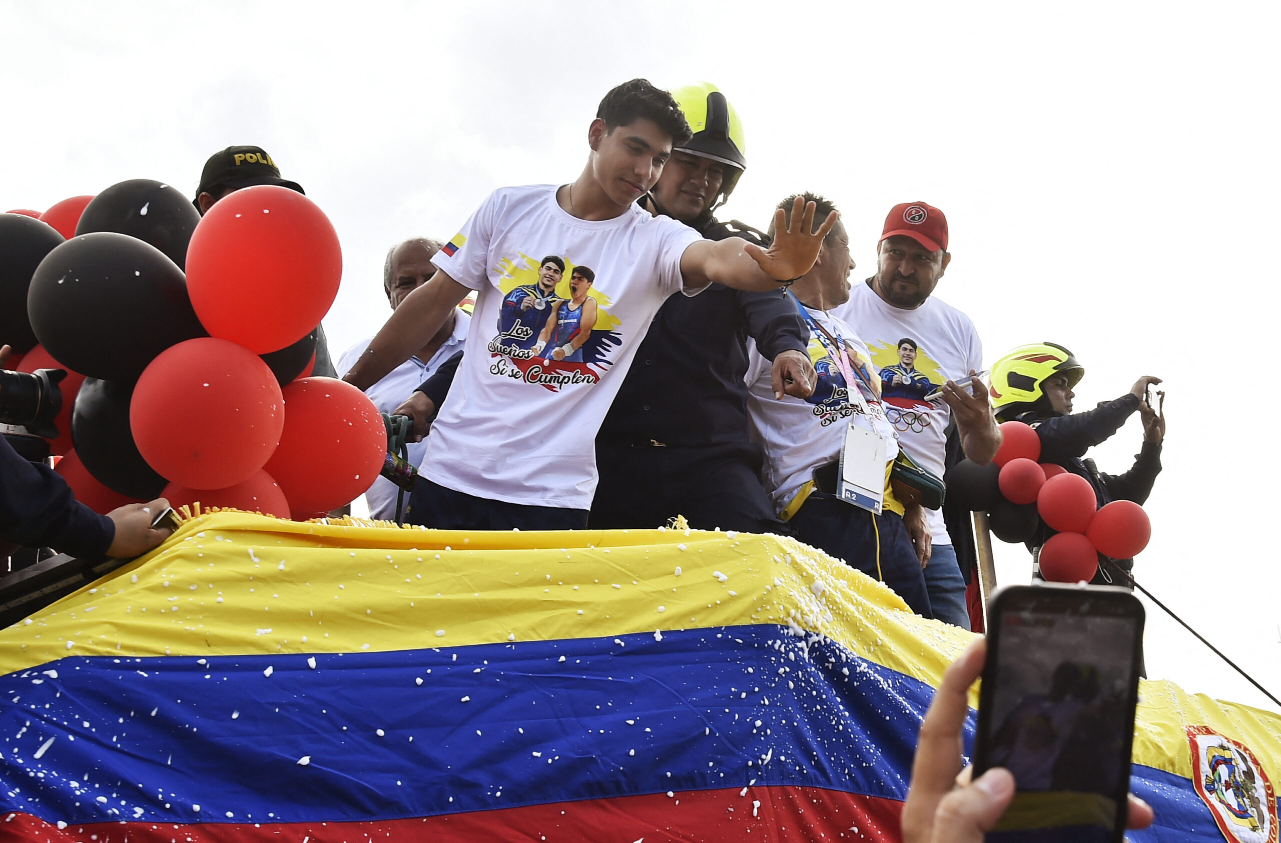En carro de bomberos y con banda marcial terminó siendo recibido Ángel Barajas, sobre las 5 de la tarde. La gente, por supuesto, aprovechó para grabar videos, tomar fotos y celebrar por un suceso histórico para el deporte colombiano. Por su parte, el joven agradeció el apoyo con aplausos.