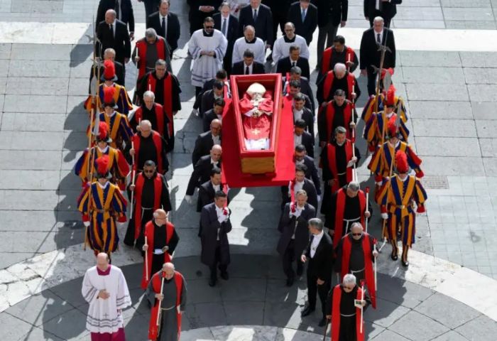 Desde la residencia de Santa Marta fue llevado en procesión el féretro del sumo pontífice, en compañía de cardenales y guardias suizos, quienes desde el día de ayer custodian los restos del religioso.