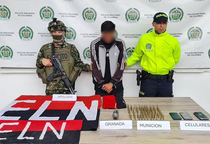 Durante el procedimiento fueron incautados 85 cartuchos calibre 5.56, una granada IM26, tres banderas con insignias del ELN y tres teléfonos celulares, elementos que quedaron a disposición de las autoridades judiciales como material probatorio.