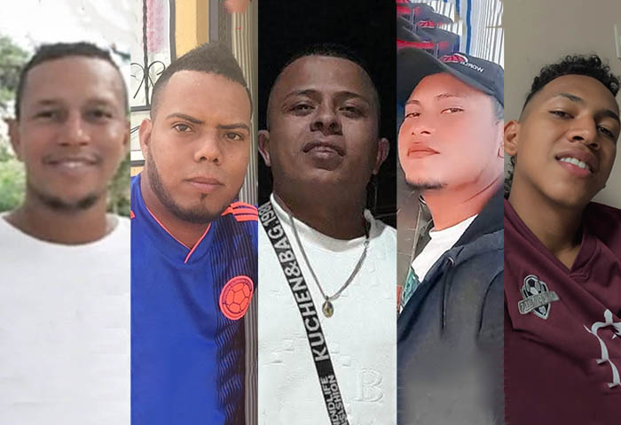 Las víctimas fueron identificadas como Víctor Manuel Jurado Maza, de 32 años; Eider Enrique Cantillo, de 33; Álex Alfonso Mendoza Ávila, de 25; Jean Carlos Meza, de 27, y Janer Luis Bustamante, de 23 años.