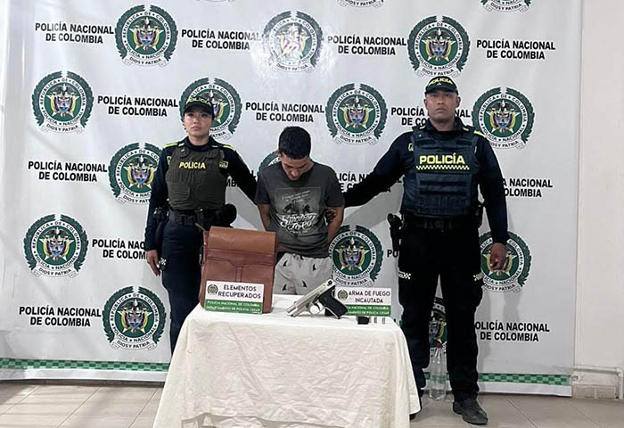 El sujeto fue capturado por los delitos de hurto y fabricación, tráfico, porte o tenencia de armas de fuego, accesorios, partes o municiones, siendo informado de sus derechos y trasladado a la Unidad de Reacción Inmediata (URI), donde quedó a disposición de la autoridad judicial competente para su proceso de judicialización.