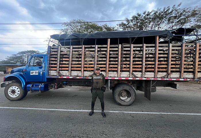 El procedimiento se registró en el kilómetro 114 de la vía Valledupar-Los Cauchos, donde uniformados adelantaban actividades de registro y control, logrando identificar un vehículo tipo camión que transportaba semovientes sin la documentación requerida.