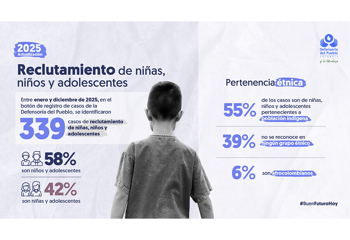 De acuerdo con cifras actualizadas de la entidad, entre enero y diciembre de 2025 se registraron 339 casos de reclutamiento de niñas, niños y adolescentes. De estos, el 58% corresponde a niños y adolescentes, mientras que el 42% son niñas.
