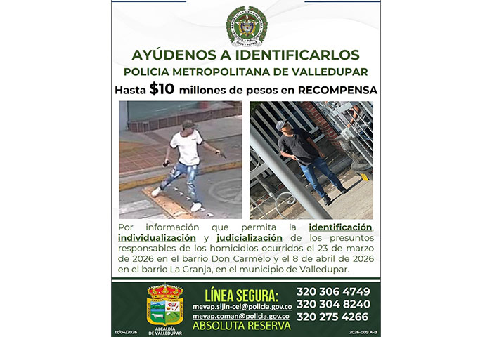 En ese sentido, el coronel Germán Alexander Gómez Aranguren, comandante de la Policía Metropolitana de Valledupar, indicó que, con el propósito de fortalecer el esclarecimiento de estos delitos de alto impacto, se dispuso una recompensa de hasta $ 10.000.000 de pesos, orientada a incentivar la colaboración ciudadana y obtener información clave que permita identificar, ubicar y judicializar a los responsables.